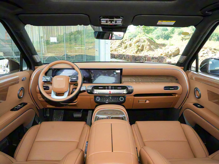 再来看车身侧面部分,新车的侧面采用悬浮式车顶设计,尤其是宽厚的D柱为银色金属饰板包裹装饰,整体豪华感十足,并且新车5065mm车长配合2970mm轴距,大尺寸车身视觉效果霸气,前轮距可调设计实现大角度的接近角。外扩式轮眉搭配19-21英寸梯度轮毂,轮胎选用米其林Primacy SUV系列,兼顾静音与耐磨。车顶行李架承重80kg,侧踏板离地高度380mm,保持235mm最小离地间隙的同时方便上下车。